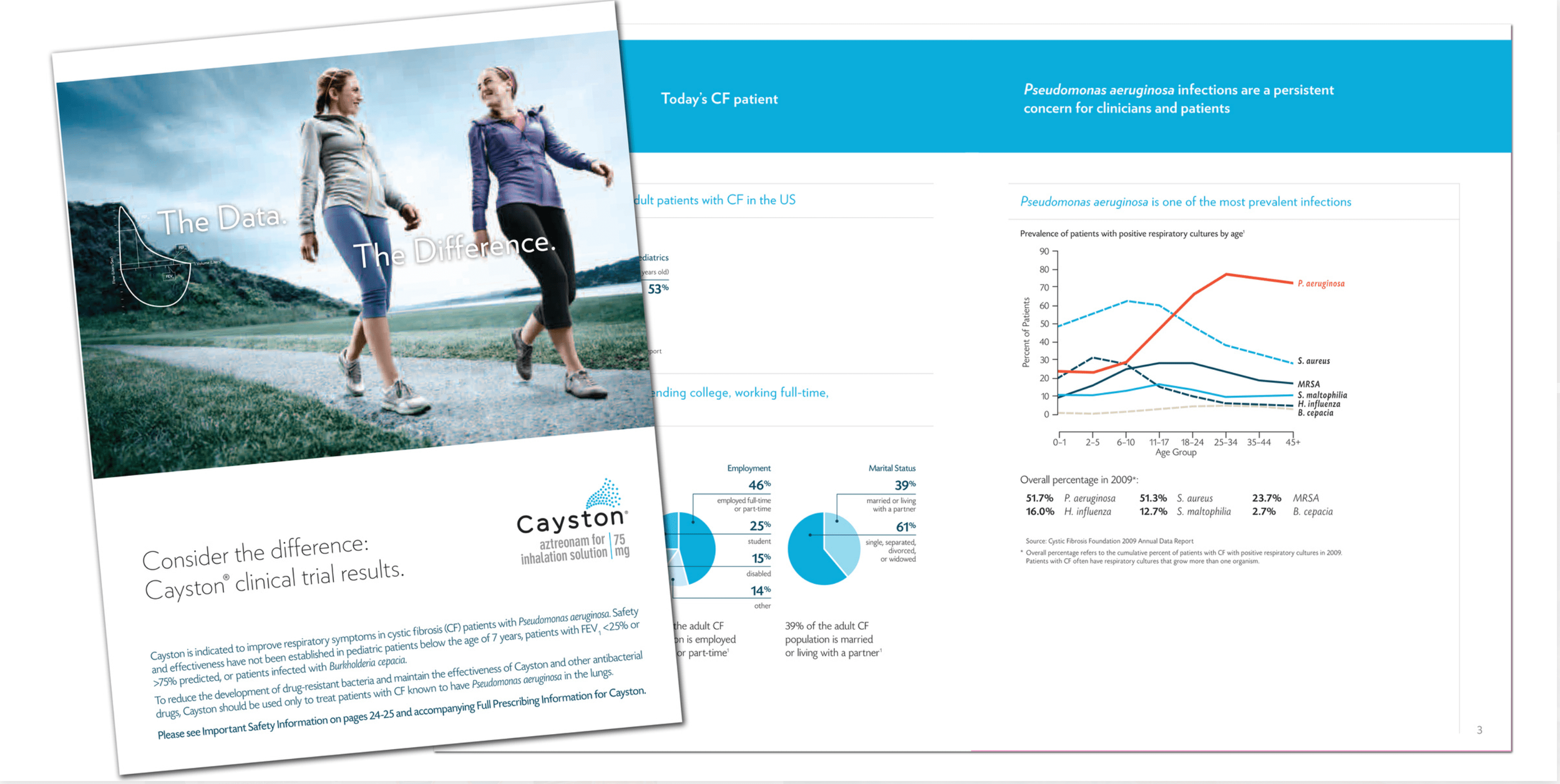 Cayston was a new drug that helped fight an infection caused from Cystic Fibrosis. We landed on a campaign that used real patients that used Cayston. The real Patients were shot in a heroic forced perspective that really highlighted them and their triumph over their infections with big sky and easy breathing. Whithin the landscape we portrayed their graph which shown improved healing whithin each image.